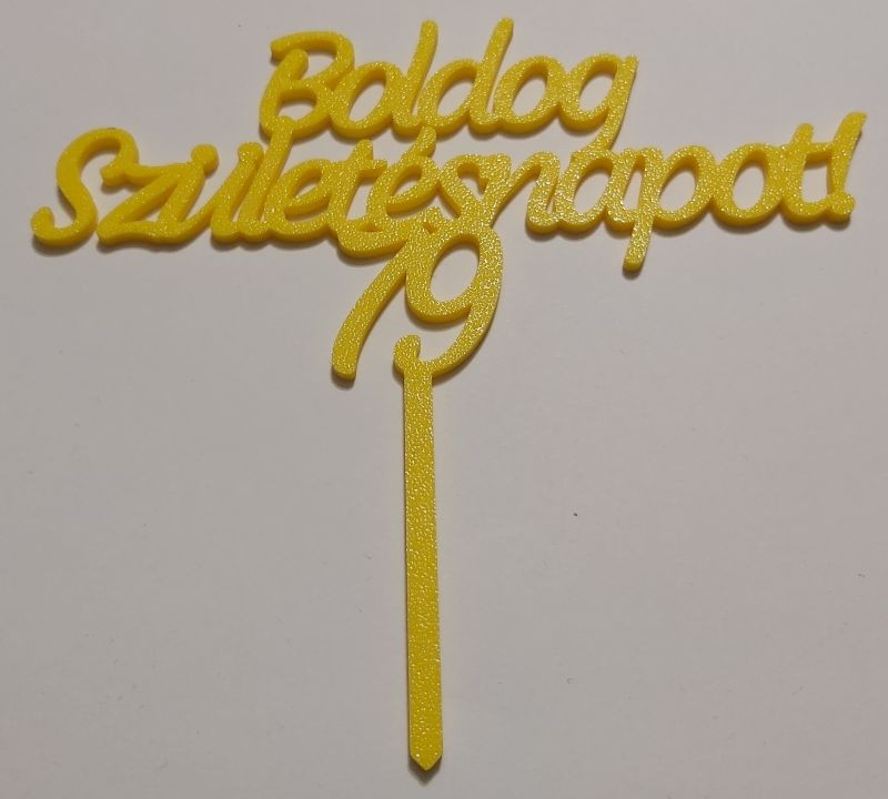 A Boldog születésnapot tortadísz egy elegáns, személyre szabható tortadekoráció, amely megadható évszámmal teszi különlegessé az ünneplést. PLA műanyagból készül, amely könnyű és formatartó, így biztonsággal használható süteményeken. A gondos 3D nyomtatásnak köszönhetően méretpontos és tartós, ezért jól illeszthető különféle torták tetejére. Egyszerűen tisztítható langyos, mosogatószeres vízzel, azonban a magas hő miatt mosogatógépben nem ajánlott használni. Letisztult formája harmonikusan kiegészíti az ünnepi dekorációt.