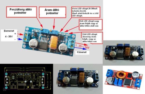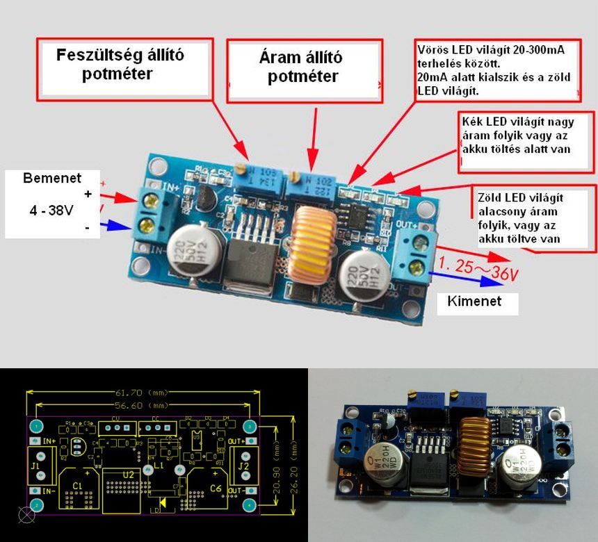A DC–DC feszültségszabályzó modul megbízható megoldást nyújt LED-meghajtáshoz, akkumulátortöltéshez és különféle elektronikai eszközök stabil tápellátásához. A beállítható áram- és feszültségtartomány rugalmas felhasználást tesz lehetővé, miközben a kapcsolóüzemű kialakítás magas hatásfokot biztosít. A két többfordulatú potenciométer segítségével pontos finombeállítás végezhető. A modul kompakt mérete miatt könnyen beépíthető, és természetes hűtéssel vagy hűtőbordával is üzemeltethető. A bemeneti feszültségnek minden esetben magasabbnak kell lennie a kimeneti értéknél.