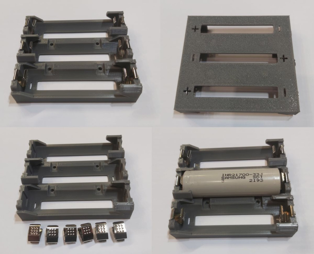 3 db-os 21700 Li-ion akkumulátortartó lapos érintkezőkkel, rögzíthető és forrasztható kialakítással.
