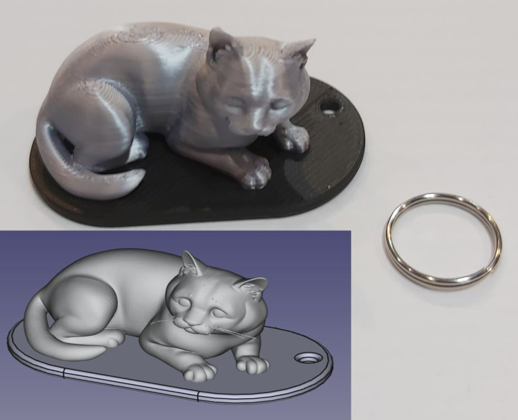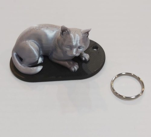 Ezüstszínű macska kulcstartó PLA műanyagból, amely praktikus és dekoratív kiegészítő a mindennapokra.