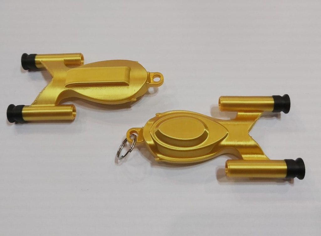 Az aranyszínű űrhajó kulcstartó dekoratív és funkcionális kiegészítő, amely ideális választás mindennapi használatra vagy ajándéknak. A kulcstartó 3D nyomtatással készül, PLA vagy PETG műanyag felhasználásával, ami pontos méretkialakítást és jó tartósságot biztosít. A gondosan megtervezett forma könnyű, mégis stabil szerkezetet eredményez, így nem terheli feleslegesen a kulcscsomót. Az űrhajó alakú kulcstartó jól illeszkedik modern és technikai stílusú kiegészítők közé, miközben hosszabb távon is megőrzi formáját és színét normál használat mellett.