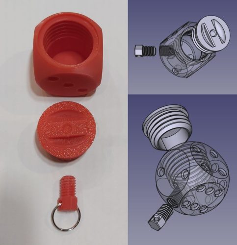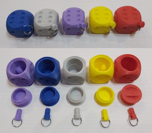 Dobókocka kulcstartóra, üreges tároló doboz belsővel, XL méretű, 34x34mm, kicsavarható menetes kulcstartó vég. ver2