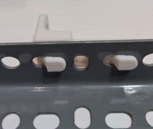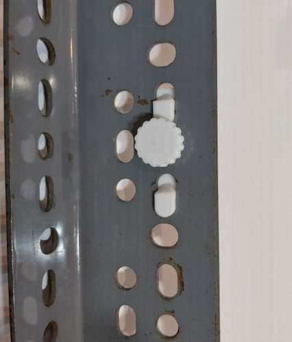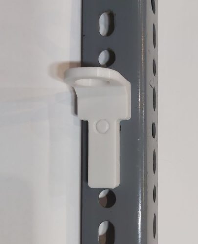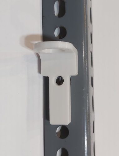 A kiegészítőkön lévő két kampót, két ovális lyukba kell ütközésig betolni, majd egy határozott mozdulattal 2-3mm-et függőlegesen le kell tolni, így rögzül a DEXION oszlopon.