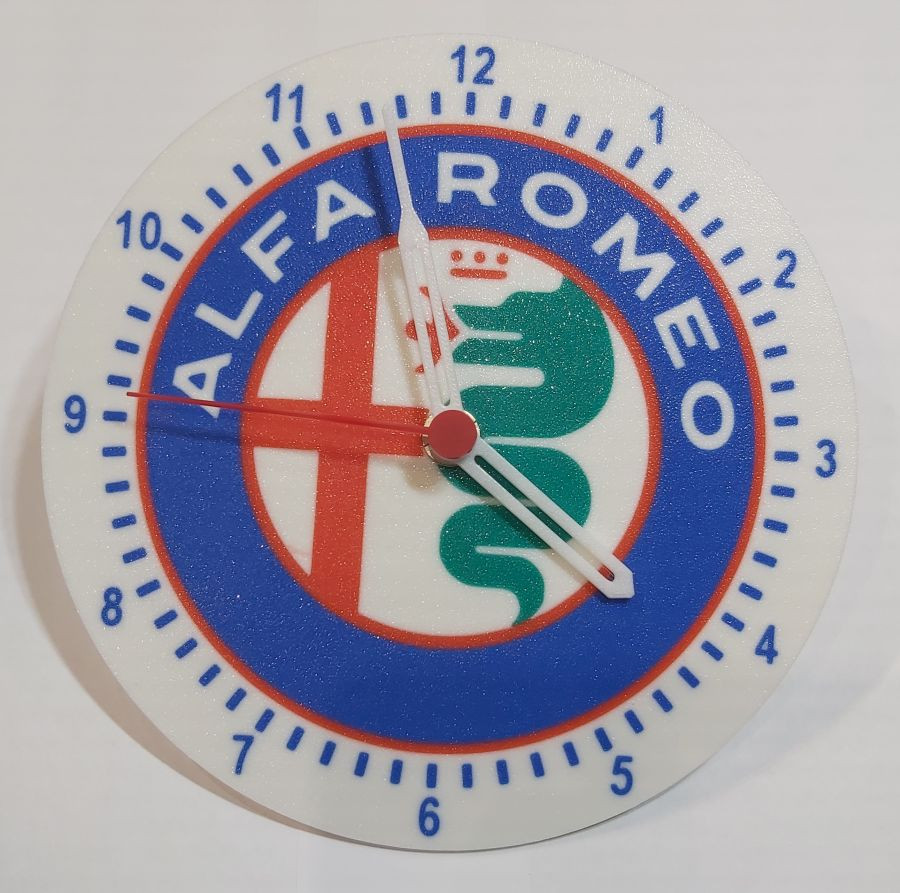 Egyedi falióra Alfa Romeo 175mm, plusz óraszerkezet.Óra működtetéséhez egy darab AA elem kell, ami nem tartozék.Alap fekete óra és perc mutató, pluszban kérhető fehér óra és perc mutató is.Feladás esetén nem szereljük össze a sérülés elkerülése véget, a boltban összeszerelve is át tudjuk adni.Az óraszerkezet könnyen cserélhető akár más típusokra is.Kérésre az óra számlap hátuljára egyedi méretű óraszerkezet tartót is készítünk.Az óra számlap közepén 10mm átmérőjű lyuk van, hátul egy 3mm vastag hatszög pozicionáló van, az óraszerkezet tartó dobozához, ami levehető a számlap hátuljáról.Szerelés az óraszerkezet csavarjával lehet összehúzni, utána a mutatókat kell felrakni, más nem is kell.Szín: a képen láthatóAnyaga: műanyag PLAHőmérséklet: 60 fok max, ezért kérem mosogatógépbe ne tegye, mert vetemedik.Tisztítás langyos mosogatószeres vízzel, lehetséges, az óraszerkezet kivétele után.Méret óra számlap: 175x2mm, plusz az óratartó szerkezet házaAz óra előlapon lévő kép, vagy felirat nem festéssel kerül fel, hanem 3D nyomtatással 0,6mm mélyen van a felületben, ezért nem kopik le.