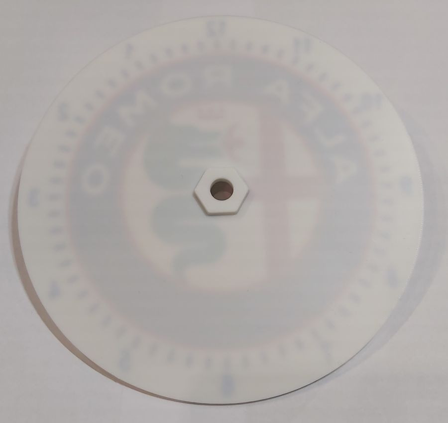 Stílusos, 3D nyomtatott Alfa Romeo falióra 175 mm-es számlappal, tartós PLA anyagból.