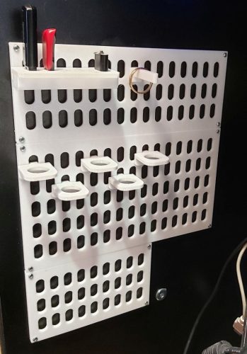A 3D nyomtatott PET-G műanyag panel méretpontos gyártással készül, így biztos illeszkedést és hosszú távú használhatóságot nyújt. A PET-G anyag jó hőállósággal és mechanikai szilárdsággal rendelkezik, ezért a panel műhelyi és irodai környezetben is megbízhatóan alkalmazható. A rendszer folyamatosan bővíthető új kiegészítőkkel, akár egyedi igények szerint is.