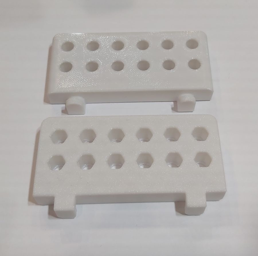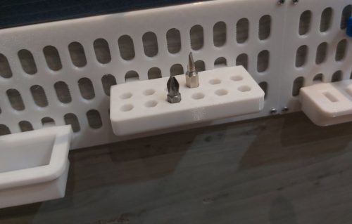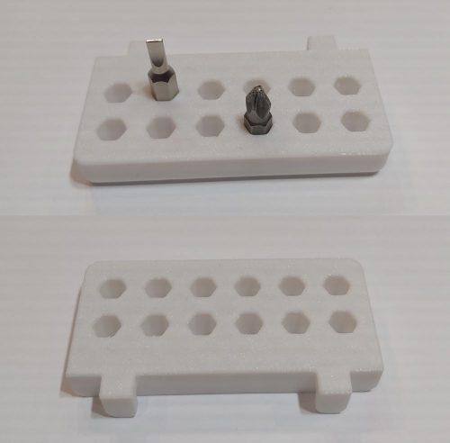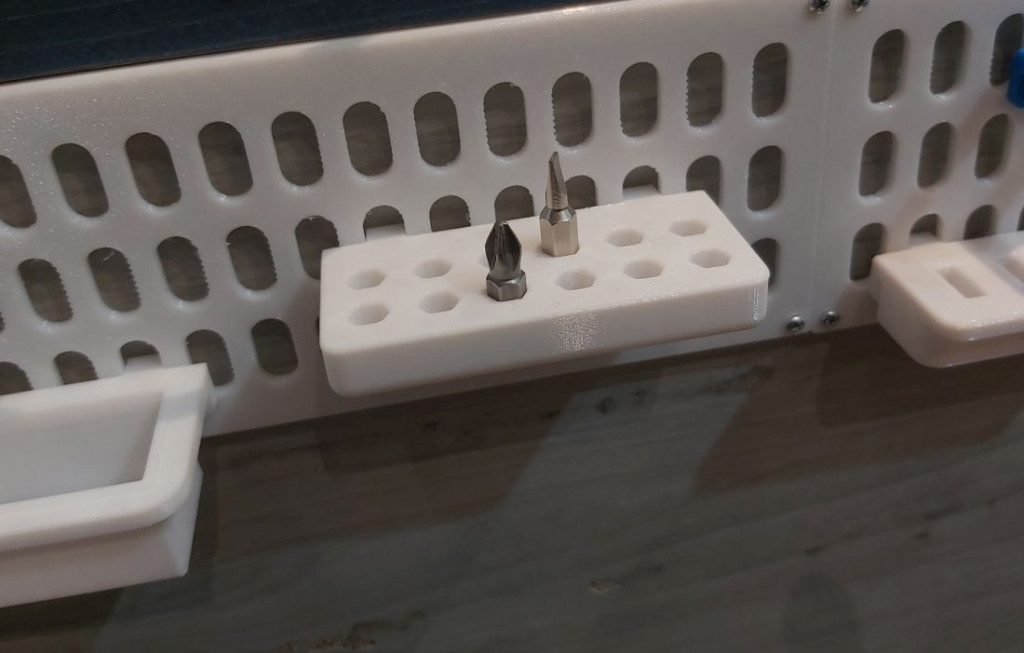 Ez a rácsos panelre szerelhető bitfejtartó kifejezetten 12 darab bitfej tárolására készült, kompakt méretben. A kialakítás lehetővé teszi, hogy a hosszított bitek lefelé kilógjanak, míg a 11 mm mély hatlapfejű fogadó stabil tartást biztosít. A tartó alján kialakított 5,7 mm-es furat segíti a könnyű elérhetőséget és kivételt.