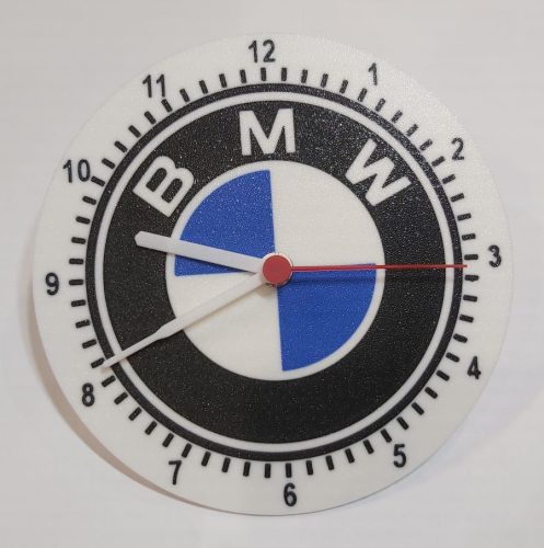 Az egyedi kialakítású, 3D nyomtatott falióra tartós PLA műanyagból készül, amely pontos méreteivel és finom részleteivel esztétikus kiegészítője lehet bármely helyiségnek. A falióra számlapja 175 mm-es átmérővel készül, felületén a BMW motívum 0,6 mm mélyen, közvetlenül a nyomtatott rétegben jelenik meg, így nem kopik és hosszú távon megőrzi megjelenését. A falióra cserélhető óraszerkezettel működik, amely egyetlen AA elemmel használható (nem tartozék), és igény szerint különféle mutatószínekkel is kérhető. A PLA anyag könnyű, formatartó, azonban 60 °C felett vetemedhet, ezért tisztításkor a langyos, mosogatószeres víz ajánlott, az óraszerkezet eltávolítása után.