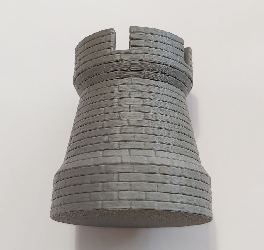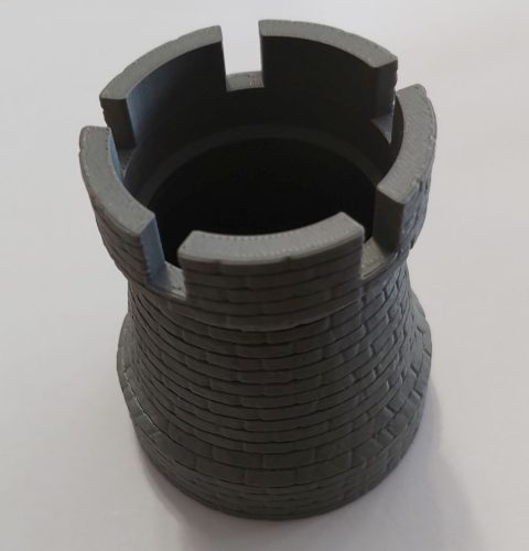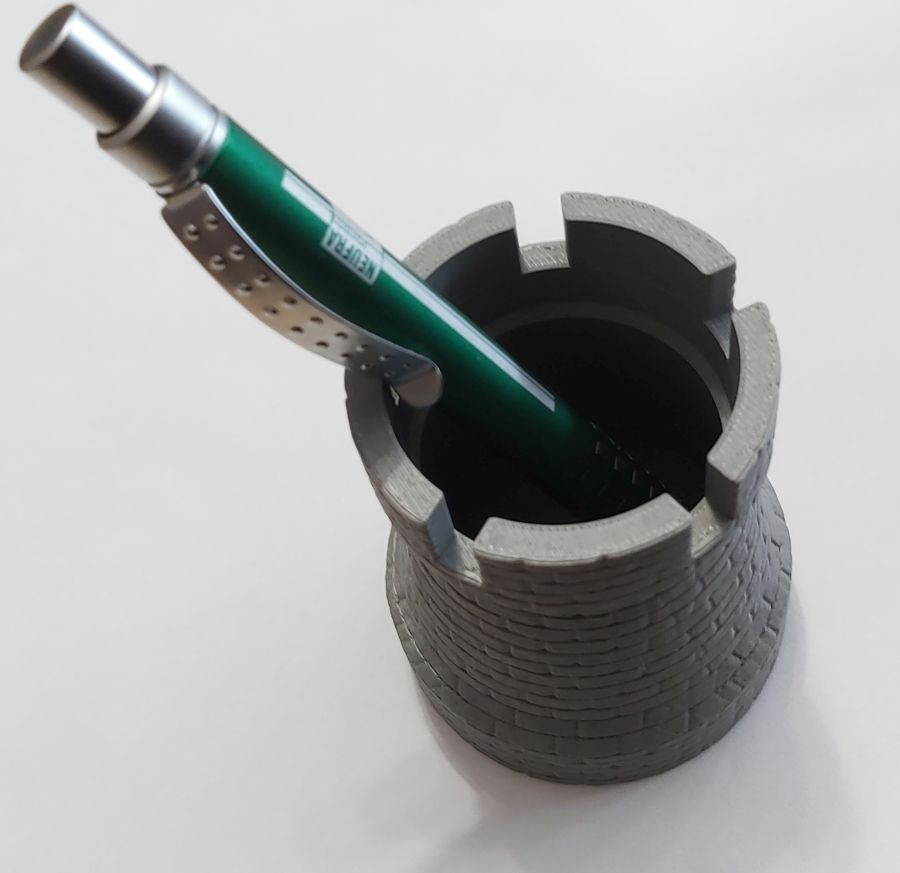 Bástya formájú tolltartó 3D nyomtatással, egyedi beton színű megjelenéssel és praktikus tárolással.