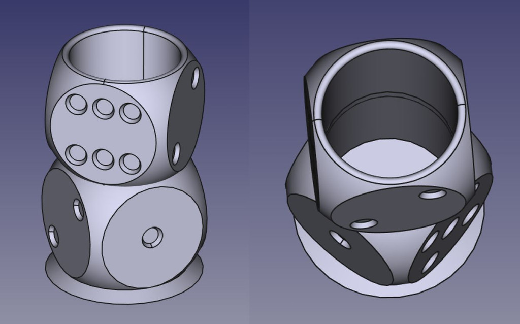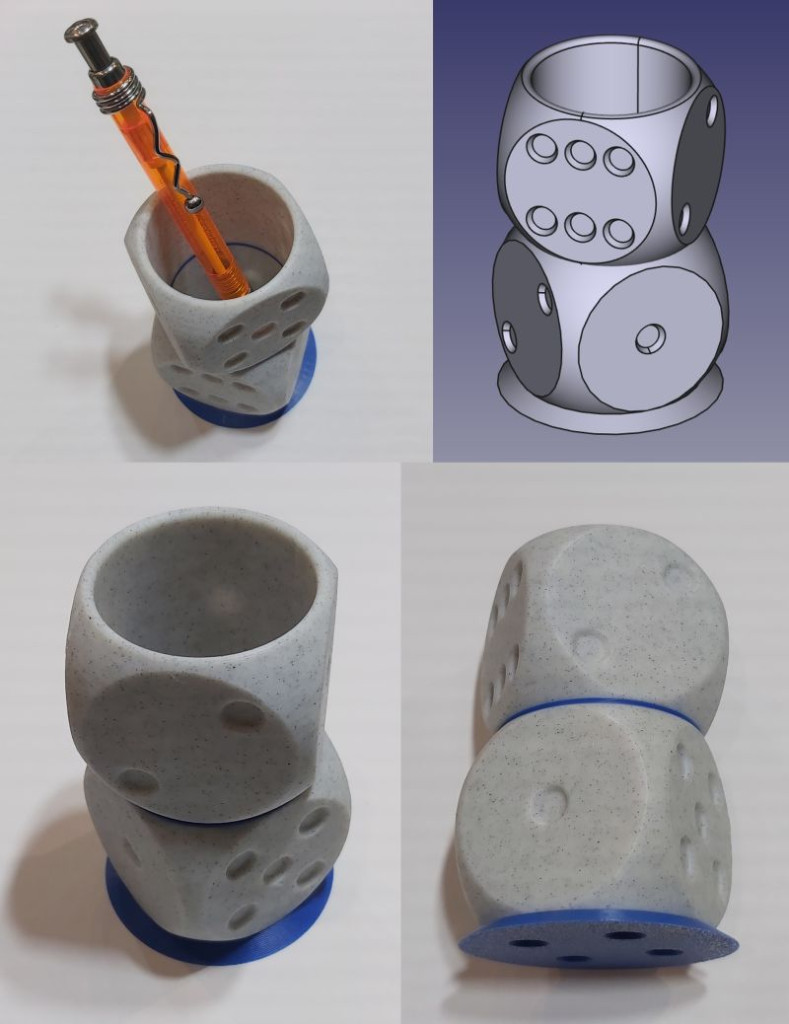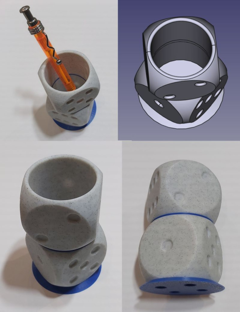 Ez a dobókocka tolltartó különleges, forgatott kocka formájával modern és figyelemfelkeltő kiegészítője lehet bármilyen íróasztalnak. A 3D nyomtatott tolltartó PLA műanyagból készül, amely megfelelő tartósságot és stabil szerkezetet biztosít a mindennapi használathoz. A kék és márvány színkombináció esztétikus megjelenést ad, így nemcsak praktikus, hanem dekoratív elem is.