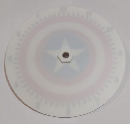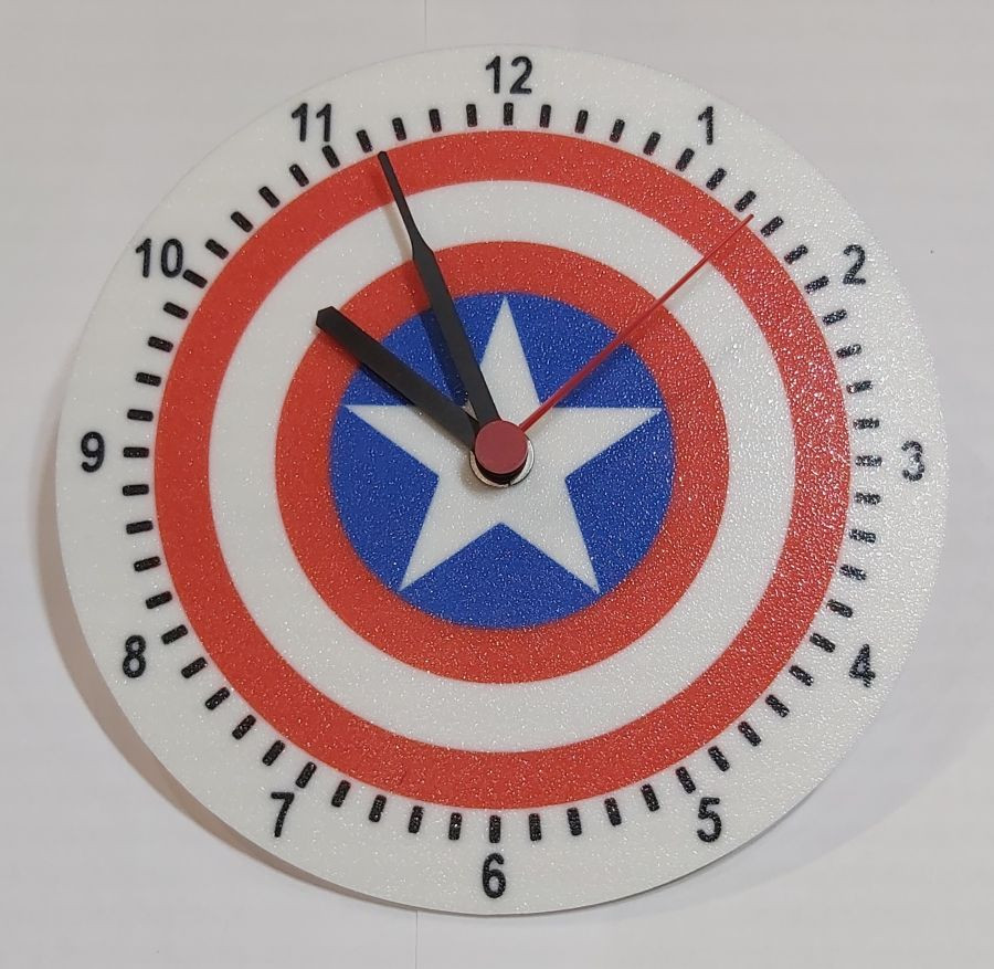 Egyedi falióra Amerika kapitány pajzs 175mm, plusz óraszerkezet.Óra működtetéséhez egy darab AA elem kell, ami nem tartozék.Alap fekete óra és perc mutató, pluszban kérhető fehér óra és perc mutató is.Feladás esetén nem szereljük össze a sérülés elkerülése véget, a boltban összeszerelve is át tudjuk adni.Az óraszerkezet könnyen cserélhető akár más típusokra is.Kérésre az óra számlap hátuljára egyedi méretű óraszerkezet tartót is készítünk.Az óra számlap közepén 10mm átmérőjű lyuk van, hátul egy 3mm vastag hatszög pozicionáló van, az óraszerkezet tartó dobozához, ami levehető a számlap hátuljáról.Szerelés az óraszerkezet csavarjával lehet összehúzni, utána a mutatókat kell felrakni, más nem is kell.Szín: a képen láthatóAnyaga: műanyag PLAHőmérséklet: 60 fok max, ezért kérem mosogatógépbe ne tegye, mert vetemedik.Tisztítás langyos mosogatószeres vízzel, lehetséges, az óraszerkezet kivétele után.Méret óra számlap: 175x2mm, plusz az óratartó szerkezet házaAz óra előlapon lévő kép, vagy felirat nem festéssel kerül fel, hanem 3D nyomtatással 0,6mm mélyen van a felületben, ezért nem kopik le.