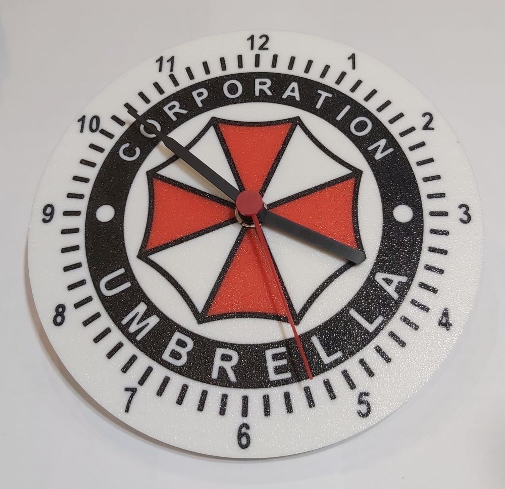 Egyedi falióra Umbrella corporation 175mm, plusz óraszerkezet.Óra működtetéséhez egy darab AA elem kell, ami nem tartozék.Alap fekete óra és perc mutató, pluszban kérhető fehér óra és perc mutató is.Feladás esetén nem szereljük össze a sérülés elkerülése véget, a boltban összeszerelve is át tudjuk adni.Az óraszerkezet könnyen cserélhető akár más típusokra is.Kérésre az óra számlap hátuljára egyedi méretű óraszerkezet tartót is készítünk.Az óra számlap közepén 10mm átmérőjű lyuk van, hátul egy 3mm vastag hatszög pozicionáló van, az óraszerkezet tartó dobozához, ami levehető a számlap hátuljáról.Szerelés az óraszerkezet csavarjával lehet összehúzni, utána a mutatókat kell felrakni, más nem is kell.Szín: a képen láthatóAnyaga: műanyag PLAHőmérséklet: 60 fok max, ezért kérem mosogatógépbe ne tegye, mert vetemedik.Tisztítás langyos mosogatószeres vízzel, lehetséges, az óraszerkezet kivétele után.Méret óra számlap: 175x2mm, plusz az óratartó szerkezet házaAz óra előlapon lévő kép, vagy felirat nem festéssel kerül fel, hanem 3D nyomtatással 0,6mm mélyen van a felületben, ezért nem kopik le.